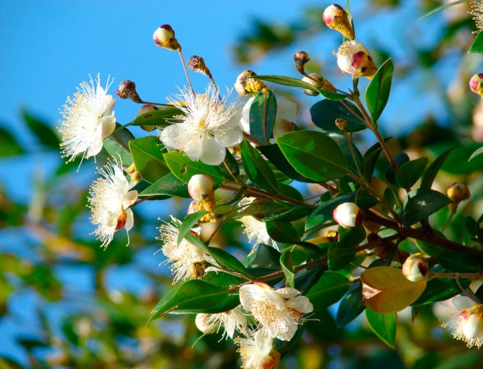 Дерево з блискучим зеленим листям з зморшкуватим краєм. Цей вид найбільш стійкий з мирта.