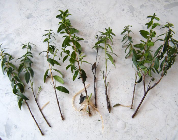 Живцювання можна провести двічі в рік: у січні та у липні. Для цього заготовляють напівздерев'янілі живці, довжина яких може варіюватися від 50 до 80 мм, більше половини листових пластин треба обрізати, при цьому ті, які залишилися, вкорочують, це дозволить зменшити випаровування вологи. Для кращого вкорінення місце зрізу рекомендується обробити засобом, що стимулює ріст коренів. На вкорінення живці висаджують у горщики або плошки, які наповнюють землесумішшю, що складається з листової грунту і крупного піску. Ємність з живцями вкривають склом (плівкою), їх прибирають в затінене місце і забезпечують їм регулярний полив і провітрювання. Для кращого вкорінення температуру повітря підтримують на рівні від 18 до 20 градусів. У живців корені відростають через 20-30 днів, потім їх висаджують в окремі горщики, в діаметрі досягають 70 мм, які заповнюють субстратом, що складається з торф'яної, дернової і перегній грунту, а ще піску (1:1:1:1). Щоб стимулювати цвітіння, мирту знадобиться рясний полив і прищіпка. Після того як кореневій системі підрослого рослинки стане дуже тісно в горщику, його треба перевалити в іншу ємність яка повинна бути трохи більше попередньої. Перше цвітіння куща, який виріс з черешка, спостерігається через 3 або 4 роки.
