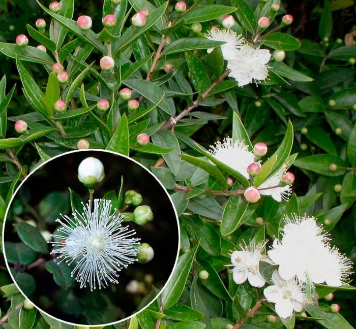 Цікавий також мирт пишний (Myrtus apiculata) – кущ або деревце з відшаровується коричневою корою, під якою стовбур кремово-білого кольору. Листя темно-зелені, еліпсоподібні, матові. Білі одиночні квітки розпускаються в липні-серпні, чорно-червоні плоди їстівні.