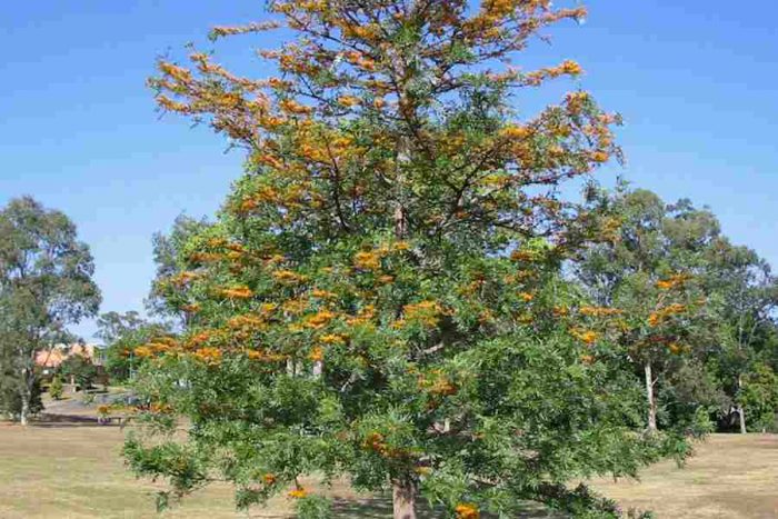 Дане дерево в природних умовах у висоту може досягати 14 метрів. Короткочерешкові непарноперисті листочки з 25-35 широколанцетнимі порізаними сегментами, в довжину бувають від 15 до 20 сантиметрів. Лицьова сторона пофарбована в насичений зелений колір, вона гладка і має виразне жилкування часток. Виворітна сторона має невелике опушення. Горизонтально розташовані, пазушні суцвіття складаються з помаранчевих квіточок. У довжину вони досягають 12 сантиметрів, а зовні дуже схожі з поздовжніми половинками циліндрів. Ця незвичайна форма суцвіть створюється маточками, спрямованими в один бік, а точніше, вгору.