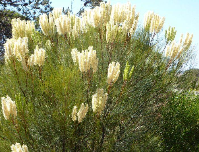 Представлена у вигляді високого (1,5–1,8 метрів) чагарнику. Сидячі зелені листочки мають вузьколанцетні формою, практично ігловідно. Гілки буквально ними обліплені. Двокольорові квіточки пофарбовані у біло-червоного кольору і зібрані в верхівкові малоквіткові суцвіття, мають форму пензля.