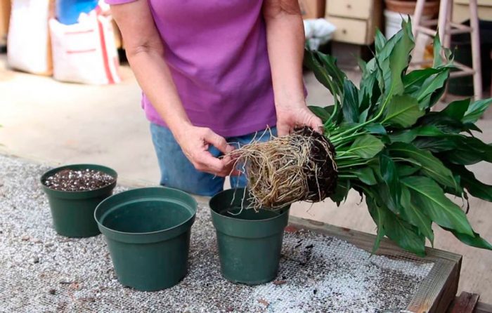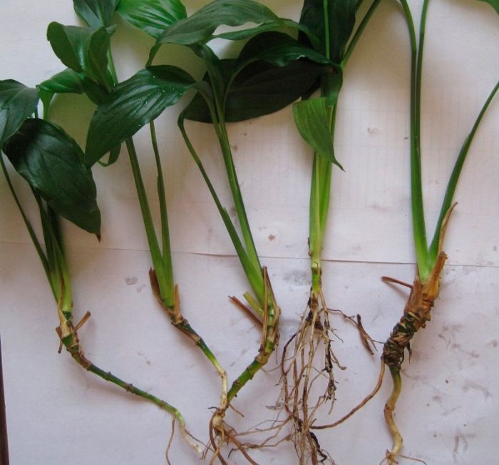 Для вкорінення живців спатифиллума рекомендується використовувати зволожений пісок. Їм необхідно тепло (не нижче 22 градусів). Після того як у живців відросте коріння, їх висаджують в індивідуальні горщики, заповнені почвосмесью, що складається з листової, торф'яної і дернової грунту, а ще піску (2:2:1:1).