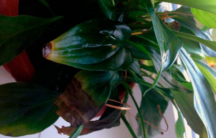 - Захворювання. Якщо в субстраті застоюється вода, то на листі утворюються коричнево-жовті плями. А якщо в кімнаті буде надмірно сухе повітря, то листя втратить свою декоративність. Ще квітка негативно реагує на надлишок або нестачу поживних речовин.