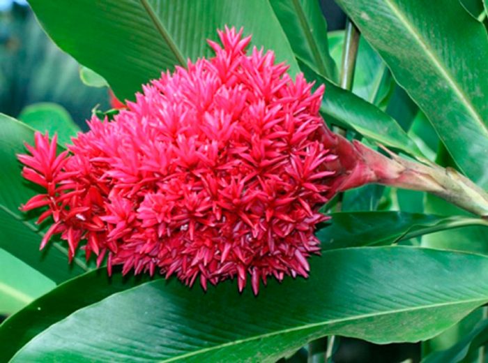 Таке вічнозелена рослина прикрашають листові пластини довгастої форми, довжина яких близько 70 мм. У даного виду формуються ефектні червоні приквітки, а з них виростають довгасті білі квітки. При вирощуванні в домашніх умовах якщо за таким квіткою правильно доглядати, то його висота може сягнути 100 див.