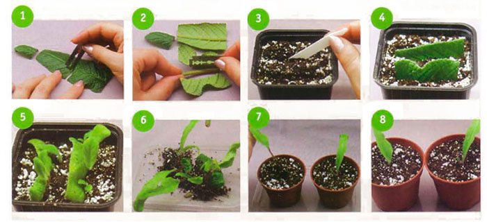 Для розмноження також можна використовувати і подовжню частина листової пластини. Для цього листок укладають на дошку лицьова поверхня вниз, а потім гострим лезом відокремлюють серединну жилку. У одержані двох частин листової пластини місця зрізів необхідно присипати вугільним порошком. Після цього їх висаджують у канавки зрізом вертикально вниз, заглиблюючи їх на 1/3 висоти листового черешка, потім субстрат трохи ущільнюють, після чого його поливають, а ємність зверху накривають плівкою. Ємність переставляють в добре освітлене і тепле місце. Молоденькі рослинки здадуться вздовж всієї листової пластини з бічних ребер. На виворітній поверхні пластини на серединної прожилке необхідно зробити двадцатимиллиметровые надрізи через кожні 2 див. Потім листової держак виворітного поверхнею пришпилюють до поверхні зволоженого субстрату, після чого його обприскують фунгіцидну засобом. Зверху ємність з живцями необхідно вкрити склом, а потім її переносять в добре освітлене місце, захищене від прямих променів сонця. Після того як здадуться молоденькі пагони, укриття необхідно трохи зрушити.