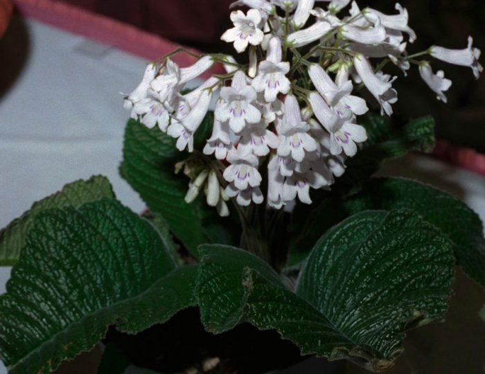 Така рослина є розеткові, його зморшкувате листові пластини завширшки досягають близько 15 сантиметрів, а в довжину ― до 45 сантиметрів. Пишне цвітіння. На поверхні білих квіток, в довжину досягають 25 мм, є пурпурові лінії. На нижній губі квітки є пурпурні смуги, а в зіві ― точки того ж відтінку.