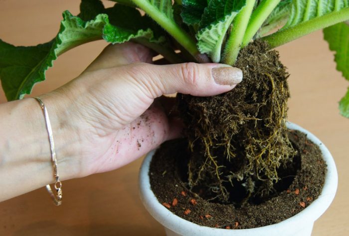 Молоденькі кущі потребують регулярної пересадки, яку слід проводити 1 раз на рік. Дорослі екземпляри пересаджують рідше, а точніше, 1 раз в 3 або 4 роки. Цю процедуру проводять у перші весняні тижні, для цього використовують широкі невисокі горщики, які заповнюють почвосмесью, що складається з листової і дернової землі та піску (4:1:2). Ще для пересадки можна використовувати субстрат, що складається з піску, перегною, дернової та листяної землі (1:1:3:2). Для цієї мети можна використовувати магазинний субстрат для сенполій. Щоб уникнути надмірного перезволоження субстрату, в нього слід всипати невелику кількість дрібного деревного вугілля. Якщо пересідає молоде рослина, то з ґрунтосуміші потрібно буде виключити дернову землю.