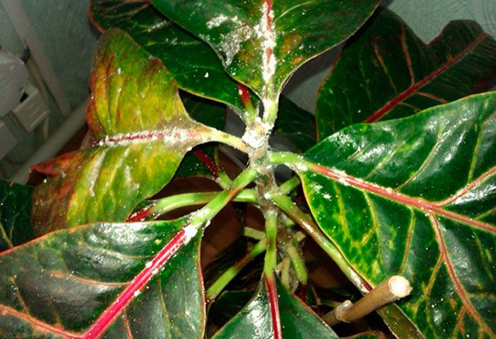 На кротоні можуть оселитися нематоди, павутинні кліщі, борошнисті червці і щитівки. Однак найчастіше він страждає від павутинних кліщів, а чому це відбувається і чому цю квітку так привабливий для даного шкідника, фахівці не можуть сказати точно. У деяких випадках перепробувавши всі способи боротьби з кліщами і зазнавши невдачі, квітникар вирішує позбутися від хворої рослини. Однак не варто забувати, що якщо дотримуватися всіх правил догляду, то на вашому квітці не поселятися шкідники. А найбільш частими причинами появи на рослині кліщів є нерегулярний полив, недостатньо висока вологість повітря, а також несистематичне протирання листових пластин. Щоб позбутися від борошнистого червця, павутинного кліща або щитівки, використовують тютюновий розчин, в який додають мило, його застосовують для протирання надземних частин куща. Через 60-90 хв. після обробки склад необхідно обов'язково акуратно змити з рослини, при цьому він не повинен потрапити в грунтосуміш.