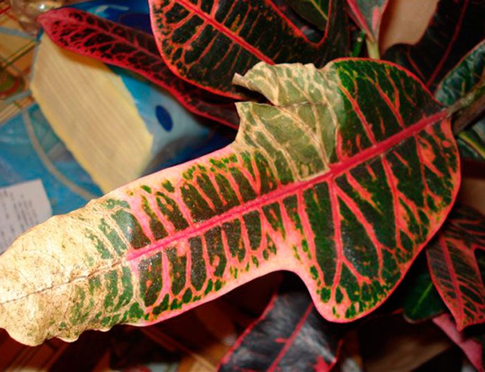 - Кущ засихає. Якщо у квітки засихають лише нижні листові пластини, то це цілком природний процес, в результаті якого спостерігається оголення нижній частині стовбура. Якщо вологість повітря недостатньо висока, то у кротона спостерігається засихання кінчиків листя, слід врахувати, що оптимальний рівень вологості для нього близько 70 відсотків. Якщо на листі утворюються коричневі цятки і спостерігається засихання її країв, то це означає, що в кімнаті холодно і кущик мерзне. Засихання і облетание листя пов'язано з надмірно рідким або мізерним поливом.