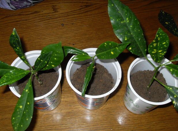 У верхівкового живця у верхній його частині листові пластини потрібно вкоротити наполовину паралельно жилках, при цьому із нижньої його частини все листя слід обірвати. Нижній зріз обробляють Корневином, після чого його поміщають у посудину з водою, яка повинна весь час підігріватися до 23-30 градусів (для профілактики розвитку гнилі). Ємність з черенком прибирають під яскраве розсіяне світло і чекають, поки в нього відросте корінці. Після того як довжина відрослих коренів дорівнює 20 мм, рослинка треба висадити в новий горщик, заповнений почвосмесью для кротона (дивіться вище). Після висаджування живців на протязі першої декади близько кущика треба підтримувати підвищену вологість повітря, для цього проводять часте зволоження рослинки з пульверизатора. Коли живці візьмуться, їх листові пластини відновлять тургор.