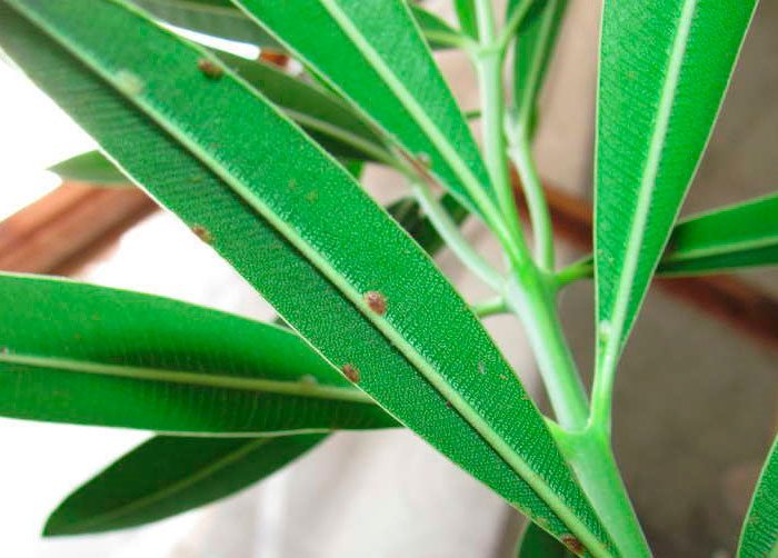 - Шкідники. Іноді олеандр уражається рак (це особиста хвороба такої культури). Найбільш часто на кущах селяться щитівки, павутинні кліщі, червці і попелиці.