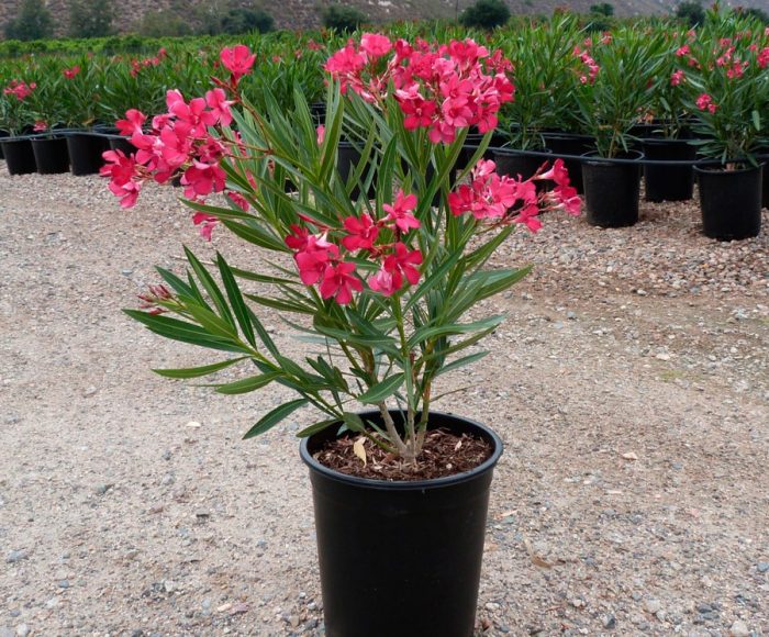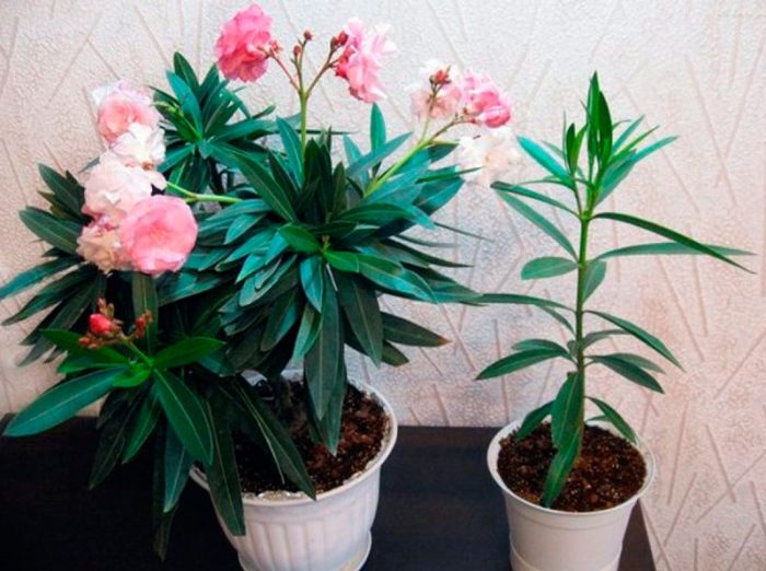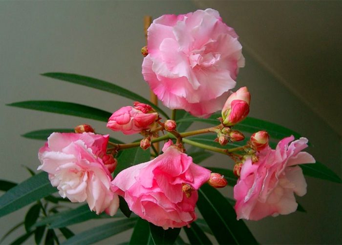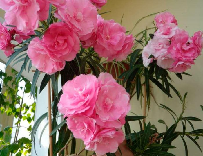 Рослина олеандр (Nerium) є представником сімейства Кутрових. За даними, взятими з різних джерел, цей рід об'єднує 3-10 видів. Латинська назва такої культури походить від грецького слова «nerion», яке перекладається як «сирий», або «вологий». Ділянка, на якому росте олеандр, повинен володіти ґрунтовими водами, розташованими досить близько до поверхні ґрунту, разом з тим дана культура володіє стійкістю до спеки. У природі вона зустрічається В субтропічних областях Середземномор'я. Такий квітка є отруйним, однак з його листя добувають речовини, використовувані для виготовлення лікарських засобів, які призначають при порушеннях діяльності серцево-судинної системи. Якщо дуже довго вдихати запах квіток кімнатного олеандра, то це може стати причиною появи головних болів. Великі квітки мають рожевим, червоним, білим або жовтим забарвленням. Найбільш часто в домашніх умовах вирощують вид олеандр звичайний (Nerium oleander). Завдяки селекціонерам на світ з'явилася велика кількість форм такої рослини з різними квітками. Якщо кущ поставити в добре освітлене місце, то за короткий час він може досягти у висоту 200 див.