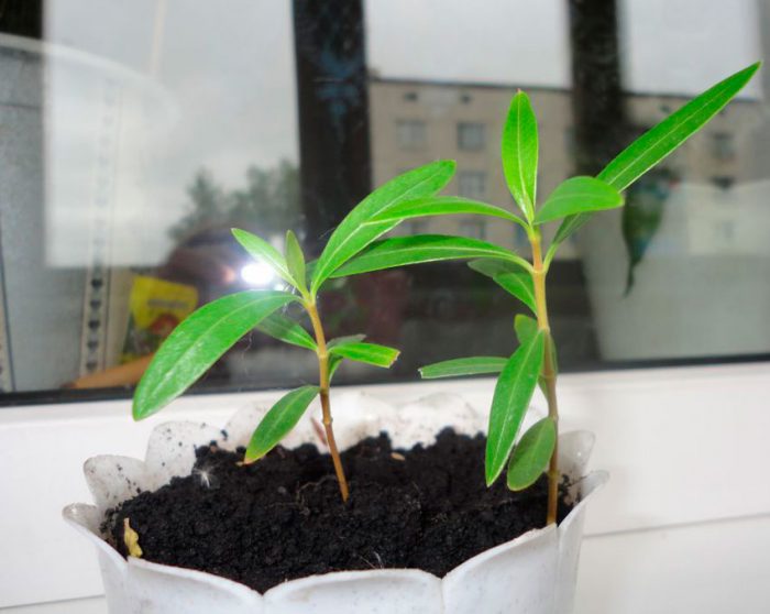 Коли здадуться сіянці, посіви треба почати досвічувати флуоресцентними лампами, при цьому не можна допускати того, щоб температура повітря опустилася нижче 18 градусів. Систематично зволожуйте сіянці з обприскувача, а також проводьте провітрювання сходів. Коли у рослинок сформується 2 справжні листові пластини за ними можна поступово починати доглядати, як за дорослими кущами. Пікіровку рослинок в окремі горщики проводять після того, як у них сформується ще 2 справжніх листової пластини. При розмноженні олеандра насінням у вирощених сіянців можуть втратити сортові ознаки.