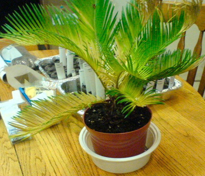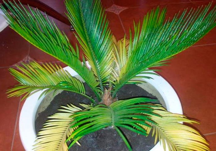 Перша проблема найчастіше пов'язана з тим, що рослина вчасно не подкармливалось яких воно не може нормально засвоїти внесені добрива з-за дуже низької температури або з-за того, що змінився водневий показник субстрату, це трапляється тоді, коли кущ систематично поливається жорсткою водою. В результаті розвиток кореневої системи припиняється. Якщо ж цикас відчуває брак поживних речовин, то його потрібно підгодувати, при цьому нова листя, що з'явилася на кущі, буде нормального забарвлення. Якщо він жовтіє з-за неправильного догляду, то йому буде потрібна пересадка в свіжий субстрат, і треба буде почати доглядати за всіма правилами. Якщо ґрунтосуміші не вистачає азоту, то в неї треба буде внести азотовмісна добриво, однак старі листові пластини все одно залишаться жовтими. Якщо ж причина в неправильній освітленості, то в цьому випадку слід врахувати, що у кожного з видів є певні вимоги до освітлення, у зв'язку з цим пожовтіння листя може бути пов'язано як з надмірною кількістю світла, так і з його нестачею. У деяких випадках пожовтіння листових пластин починається після того, як кущ переносять на свіже повітря у весняний час, попередньо не закалив його. Пожовтіння листя у цикаса може спостерігатися з-за недостатнього або дуже частого поливу, а ще в тому разі, коли кореневій системі холодно або кущ був подкормлен надмірно концентрованої живильною сумішшю. У цих випадках система коренів сигналізує про наявність проблеми пожовтінням листових пластин, тому при появі такого сигналу треба постаратися докласти всі зусилля, щоб врятувати квітку.