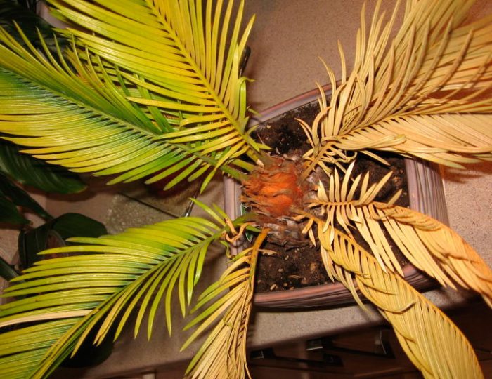 Пожовтіння і засихання нижніх листових пластин вважається природним процесом. Якщо ж в кімнаті занадто низька вологість повітря, то з-за цього будуть засихати кінчики листя, також це трапляється тоді, коли пальму підгодовують, дотримуючись неправильне дозування добрив.