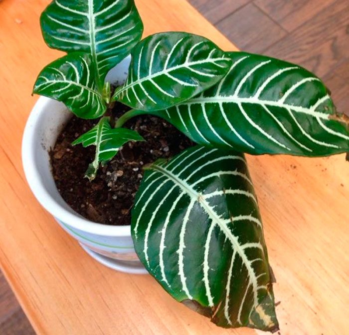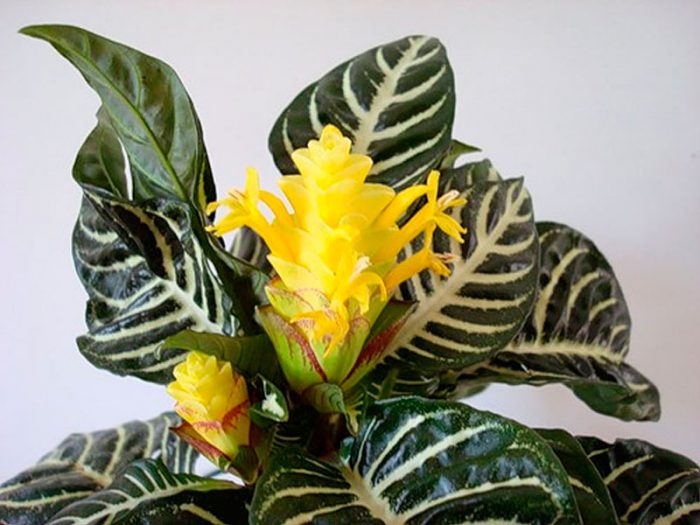 - Луїс. Стебло округле пофарбована в блідо-червоний колір. Довжина довгастих листових пластин близько 22 сантиметрів, на зеленому тлі виразно видно прожилки зелено-сріблястого або жовтого кольору. Квітки канарково-жовті, при цьому темно-жовті приквітки мають зелену прожилку.