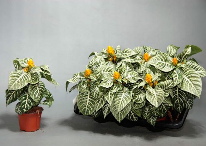 - Данія. Забарвлення суцвіть жовтий. На поверхні темно-зелених листових пластин є білувато-зелені прожилки.