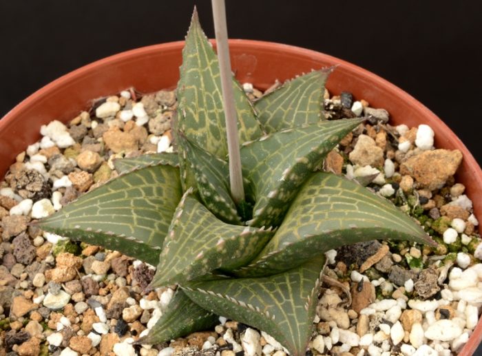 Трикутні товсті листові пластини мають зубчасту кромку, вони входять до складу маленьких розеток. На лицьовій поверхні листя є штришками білого забарвлення, які формують сітку, при цьому на виворітній ― знаходяться бородавки.