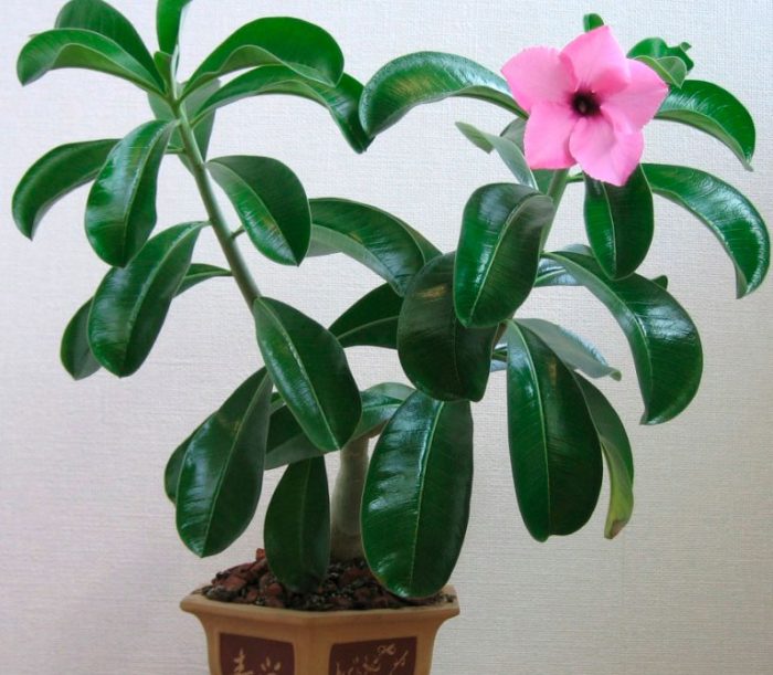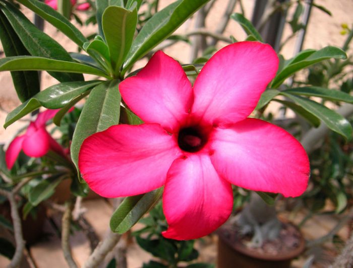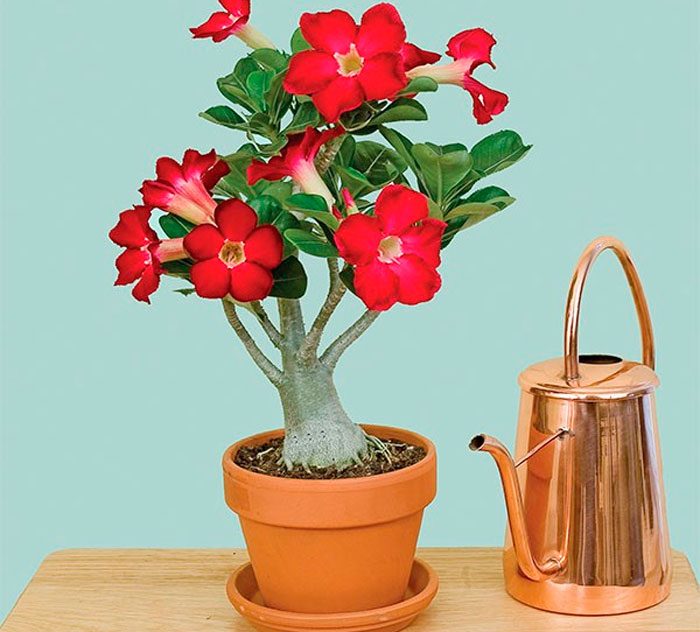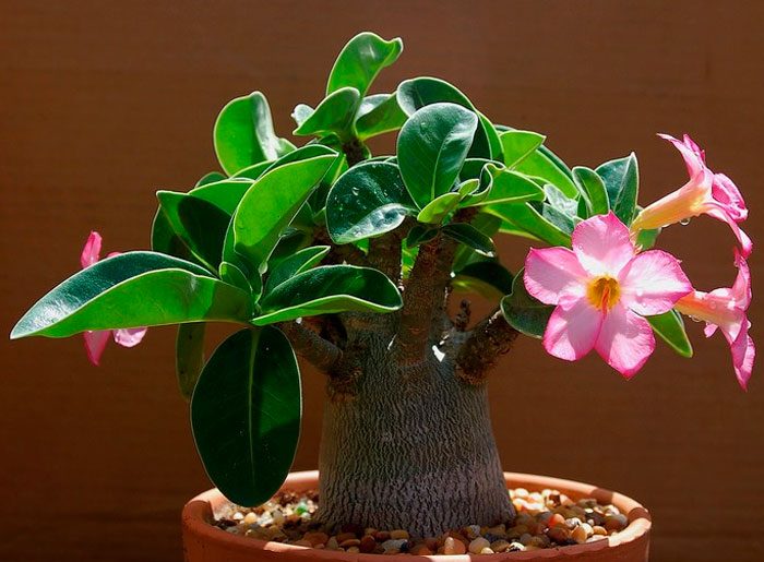 Рослина аденіум (Adenium) є представником сімейства Кутрових. В даному роду міститься 5 видів. Цей сукулент в природі зустрічається в Центральній і Південній Африці. У кімнатних умовах такі невеликі дерева або чагарники заввишки досягають близько 0,35 м. Стовбур у цього квітки товстий. Поверхня глянцевих листових пластин бархатиста. Досить великі квітки забарвлені в білий або темно-малиновий колір. В народі така рослина має безліч інших назв, найбільш популярним є «Троянда пустель», тому що ця квітка має схожість з трояндою.
