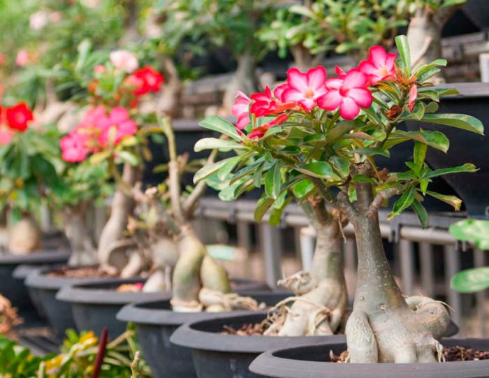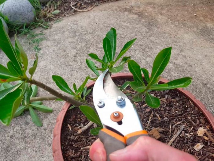 Обрізування кущів проводять лише за необхідності, а роблять це лише у весняний час. Щоб кущ сформувати у вигляді деревця, потрібно вкоротити бічні гілки на 1/3 довжини. Щоб сформувати кущ, обрізати його потрібно нижче. Формування аденіума займає досить тривалий час, і вона досить складна, проте якщо все робити правильно і своєчасно, то результат буде вражаючим.
