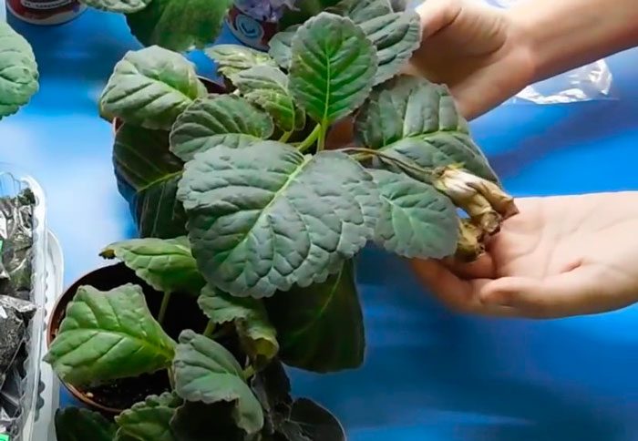 Коренева гниль ― нею глоксинія уражається найбільш часто. Коренева система забарвлюється в темно-коричневий колір, а також спостерігається перегнивание стебла біля основи, після чого квітка гине. Дана хвороба розвивається, якщо для поливу кущика використовується холодна вода, а ще це може статися, якщо у субстраті весь час буде застоюватися рідина.