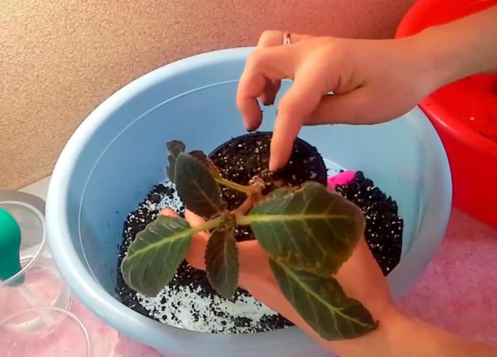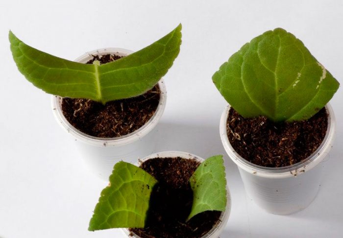 Частини листової пластини треба посадити в індивідуальні горщики, заповнені трохи зволоженою легкої почвосмесью. Їх ставлять в невелику теплицю або зверху накривають поліетиленовим пакетом. Протягом чотирьох тижнів провітрювати або поливати листової живець не потрібно. Через зазначений час частини листової пластини повинні вкоренитися, і їх необхідно почати поступово привчати до життя в кімнатних умовах, для цього потрібно на деякий час відсунути укриття. Тепличку з укорінюються листовими живцями треба поставити в тепле і світле місце.