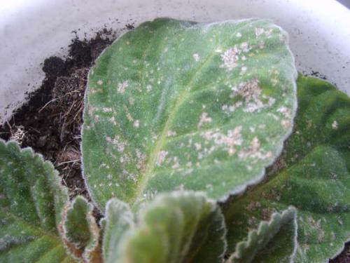 Якщо на глоксинії оселилися трипси, то на його листових пластинках з'являються штришками, точки і цятки світлого забарвлення, при цьому неушкоджений ділянка пластини набуває сріблястий блиск. Через деякий час ці ділянки засихає, а з нижньої сторони вони забарвлюється в бурий колір, при цьому спостерігається загортання країв пластини наверх. Обробіть кущ 3 рази з перервою в 7 днів інсектицидним засобом (Карбофосом, Актелліком, Актара або Фитовермом), після цього потрібно буде замінити верхній шар субстрату або повністю поміняти його. Це робиться, тому що личинки шкідника йдуть в субстрат. Тими ж самими інсектицидами можна знищити і кліщів, однак у цьому випадку заміни землесуміші не знадобиться.