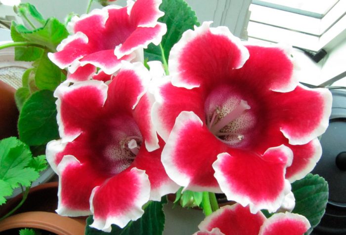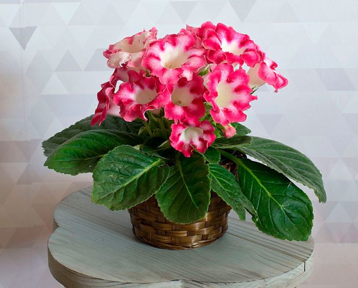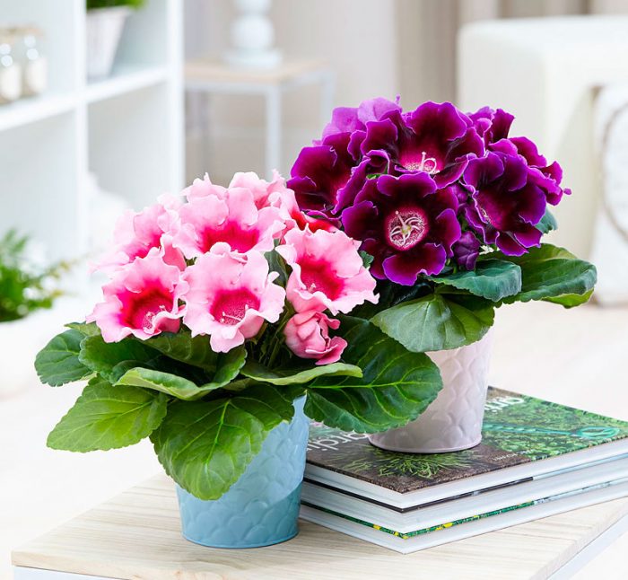 Кімнатна глоксинія представляє собою багаторічна бульбова рослина. Пагони у неї коротенькі, а соковиті листові пластини бархатисті і володіють яскраво-зеленим забарвленням. Бархатисті квітки дзвоникоподібної форми можуть бути махровими або простими, вони пофарбовані в червоний, фіолетовий, рожевий і білий колір, а також зустрічаються оборчатые, в цятку і двокольорові. В поперечнику такі квітки досягають 70 мм, а довжину ― 50 мм. У глоксинії є велика кількість насіння, які мають дуже маленьким розміром. У природних умовах налічується 25 видів цієї рослини, проте селекціонери в основному працюють лише з глоксиній прекрасною і глоксиній королевської.