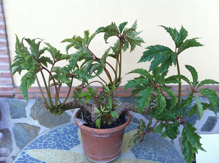 Дана бегонія відноситься до числа найбільш старих домашніх квітів. Її батьківщина-Мексика. Товщина повзучого втечі близько 4 сантиметрів. Великі пальчасто-розсічені листкові пластини розміщуються на черешках зеленувато-жовтого забарвлення. У довжину листя не перевищують 35 сантиметрів, є добре помітне жилкування. Рожево-зелені квіточки входять до складу пухких суцвіть, що мають форму пензля. Цвітіння починається в лютому.