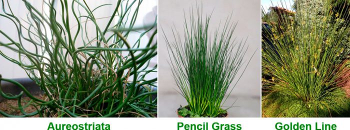 - Ситник «Pencil Grass» (Олівцева трава) ― має прямі і досить товсті стебла, які утворюють дернину більше схожу на велику траву або в'язку зеленого хмизу. Порожнисті блискучі листочки мають темний зелений окрас і ростуть в досить щільній дернинке. Їх висота може перевищувати 50 сантиметрів.