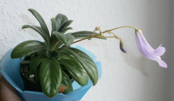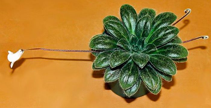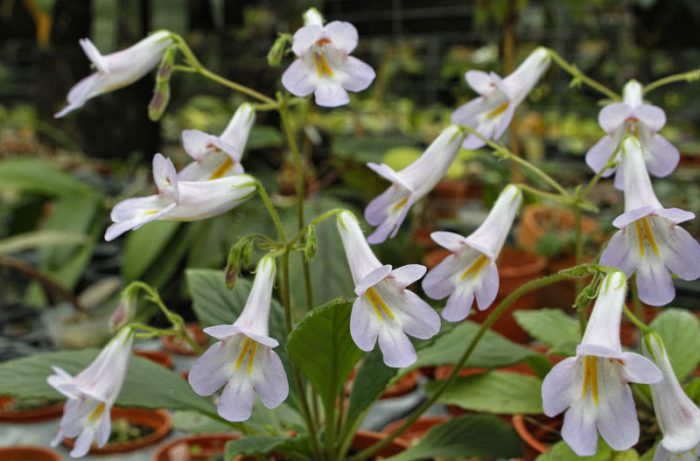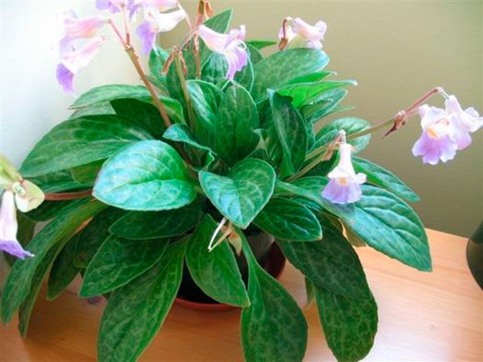 Витончені квіточки даної рослини можуть позмагатися у своїй красі з орхідеями, однак їх пристрій і форма абсолютно проста. Такі квіточки мають певну схожість з глоксиниями, а також з горечавками. П'ятипелюсткові квітки мають трубчасту форму, при цьому трубка у них досить вузенька. А мають вони світло-пастельним або білуватим забарвленням. На поверхні самого квітки і несиметричного зіву знаходяться смуги лілового і темно-фіолетового забарвлення. На досить довгих квітконосах, висота яких завжди перевищує висоту листової розетки, розташовуються суцвіття, мають форму пензля. Вони досить пухкі і складаються з 3-7 квіточок. У суцвіттях квітки, так само як і листя розташовуються симетрично і не дуже густо, що сприяє підкреслення краси і витонченості цієї рослини під час цвітіння.