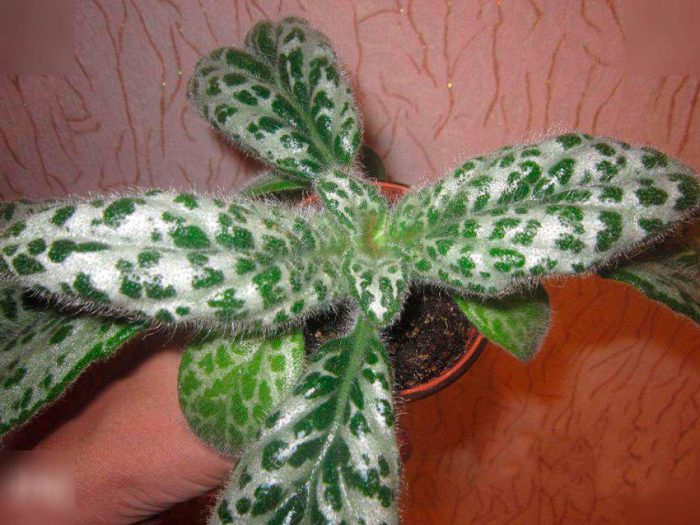 Лише у деяких видів листочки зовні віддалене схожі з фіалкою. Розташовуються вони супротивно і мають коротенькі або середньої довжини черешки. Їх поверхня може бути глянсовою, слабоопушенной, а також бархатистою (з густими волосками). Форма листових пластин безпосередньо залежить від виду і сорту і може бути яйцевидної, ромбічної, округлої, лінійної, лопатоподібної або языковидной. У більшого числа видів на поверхні листочків смужки і прожилки світлого або сріблястого забарвлення. На фотографіях неможливо оцінити всієї краси листочків. Справа в тому, що світлі візерунки наче сяють, і якщо на таку рослину дивитися вживу, то створюється враження, що на листя розлито рідке срібло, яке безперервно тече. Такий ефект чимось схожий з тим, що є у дорогоцінних орхідей.