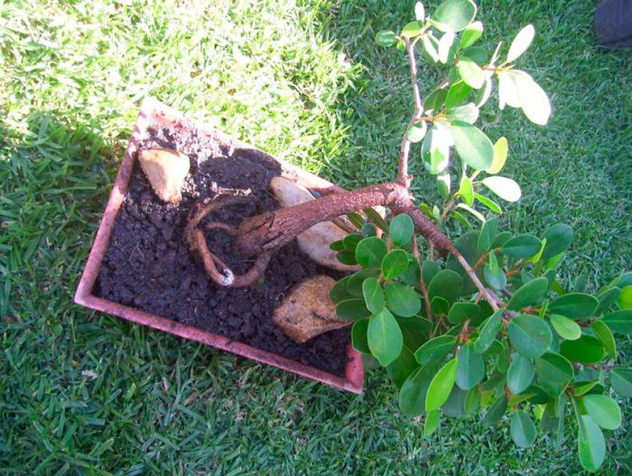 Пересаджують таку квітку тільки при необхідності. У дорослих фікусів, а також зростаючих у формі бонсай рекомендується 1 раз на рік лише замінювати верхній шар субстрату. Така процедура проводиться на початку весни, для цього слід видалити старий верхній шар грунту і насипати свіжий субстрат. Пересадити таку рослину потрібно тільки в тому випадку, якщо корінці перестануть поміщатися в горщик.