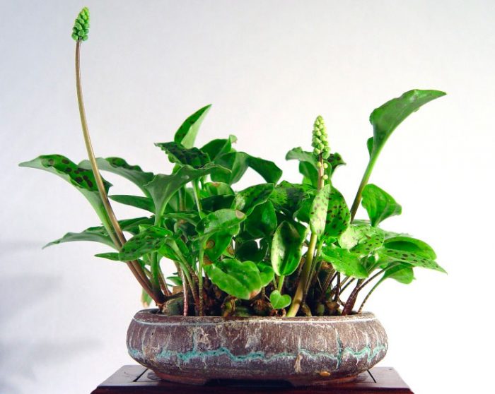 Це цибулинна рослина є многолетником. На поверхні блідо-зеленої листової пластини хаотично розкидані плями темно-зеленого забарвлення. Колосовидні або гроновидні суцвіття несуть від 10 до 30 штук білих маленьких квіточок.