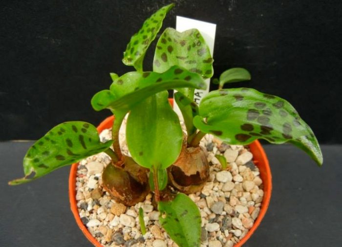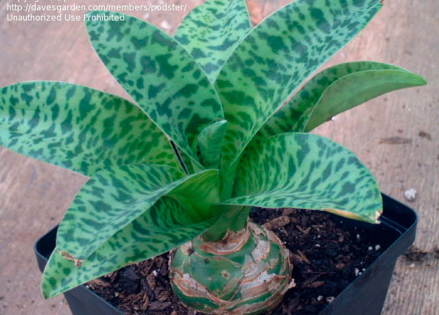 Ця вічнозелена рослина є цибулинних і у нього яскраво виражений період спокою. Округлої форми цибулина пофарбована в білий колір. Жорсткі ланцетної форми листочки звужуються до основи. Вони пофарбовані в яскраво-зелений колір, а на їх поверхні розташовуються темно-зелені цятки, внизу ― зеленувато-сірі. У довжину такі листки досягають 40 сантиметрів, а в ширину ― 5 сантиметрів. Черешків або немає, або вони дуже короткі. Довжина квітконосу варіюється від 20 до 40 сантиметрів. Колосовидне суцвіття несе маленькі білі квіточки. Цвітіння спостерігається з березня по вересень.
