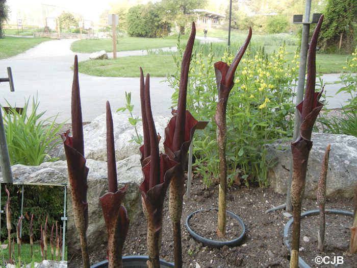 Розвиток квітки відбувається після закінчення періоду спокою і до того, поки виросте новий листочок. Цвіте рослина приблизно півмісяця, але ще до того, як виростуть нові корінці, воно припиниться. В період цвітіння розміри бульби стають значно менше. А все тому, що на ріст і розвиток квітки витрачається велика кількість поживних речовин, які беруться саме з бульби. У зв'язку з цим, після того, як рослина відцвіте, у нього знову буде нетривалий період спокою (приблизно 3-4 тижні). Після того, як він закінчиться, почне рости листова пластина. Буває, що наступив після цвітіння період спокою, що триває майже рік (до наступної весни). У тому випадку, якщо квітка запилилася, то після того як цвітіння закінчиться, почне рости супліддя, що складається з м'ясистих ягід, в яких знаходяться насіння. При цьому у випадку розвиток плодів материнське рослина гине. Цю рослину ще називають «трупною квіткою». Це тому що він володіє унікальним ароматом, який дуже схожий з запахом розклався трупа миші або протухлої риби. Однак такий аромат від нього виходить не надто довго, всього 1 або 2 доби. Тим самим рослина сповіщає комах-запилювачів, що квітка розкрилася. Чоловічі квітки, як правило, розкриваються дещо пізніше жіночих, у зв'язку з цим самозапилюється рослина вкрай рідко. Для запилення потрібно, щоб хоча б 2 рослини почали цвісти в одне і теж час.