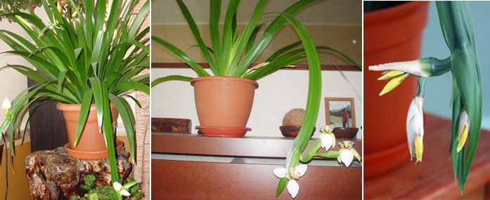 Таке трав'яниста рослина має шкірясті плоскі листочки мечовидної форми темно-зеленого забарвлення. Їх довжина варіюється від 60 до 150 сантиметрів, а ширина дорівнює 5-6 сантиметрів, при цьому вони зібрані віялом. Формування квітконосів відбувається безпосередньо на листочках, а вони несуть від 3 до 5 квіток. Такі запашні квіточки тримаються від 1 до 2 діб. Вони пофарбовані в блідо-молочний колір і мають в зіві блакитні жилки, а їх діаметр може бути дорівнює 5 сантиметрам. По закінченню цвітіння зів'ялі квіточки опадають, а на їх місці утворюється дитинко (маленька розетка листя).