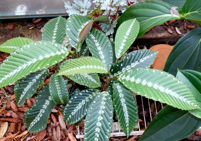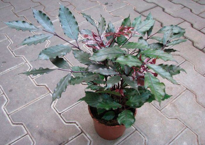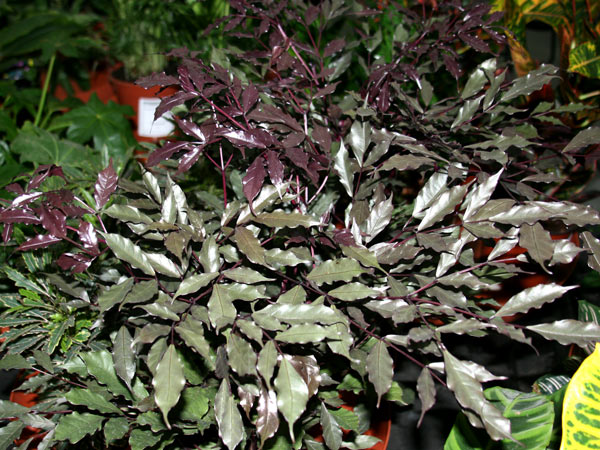 Це вічнозелений чагарник. Листові пластини є пір'ястими і складаються з окремих ланцетних маленьких листочків, краї яких загострені. Верхня поверхня листя зеленувато-бронзова, блискуча, і має білувату широку смужку, що проходить по центру, а нижня ― червонувато-ліловий, при цьому центральна смужка пофарбована в зелений колір.