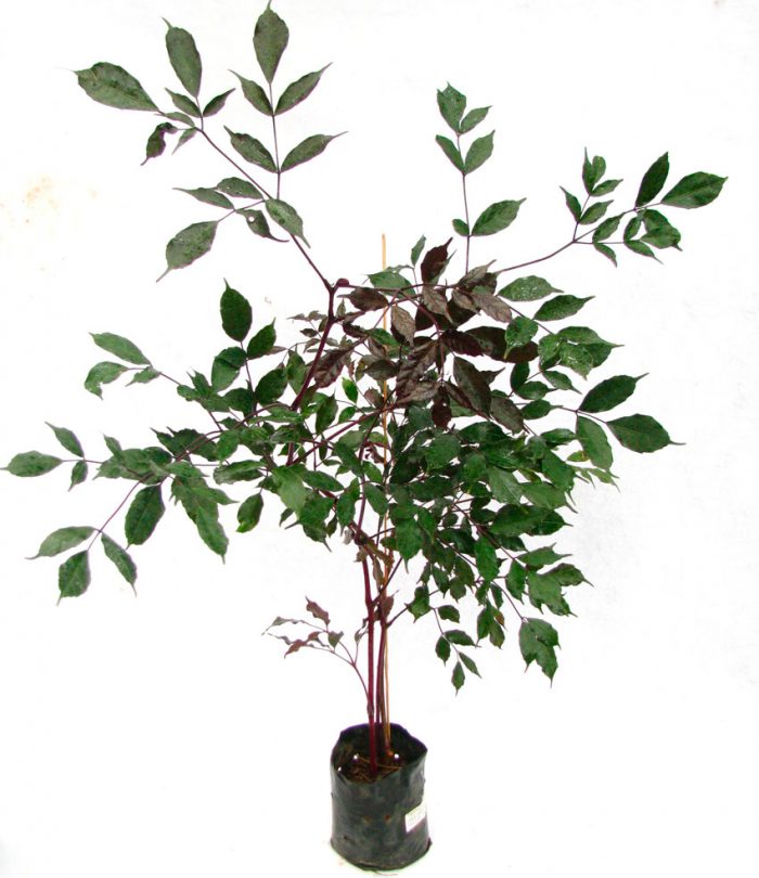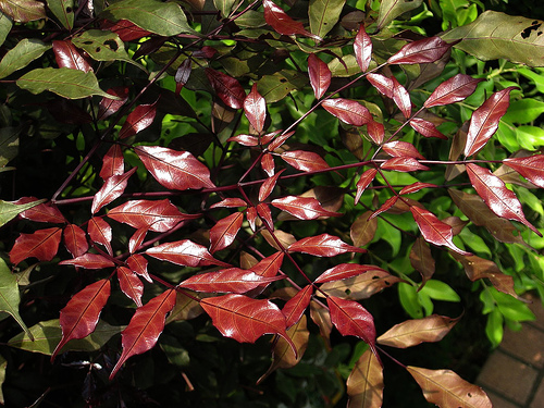 Цей чагарник є вічнозеленим. Ланцетоподібні, складні, загострені листочки мають глянсову поверхню і довжину до 60 сантиметрів. Молоденькі листя мають бронзове забарвлення, а потім він змінюється на темно-зелений. Забарвлення квіточок цегляно-червоний.