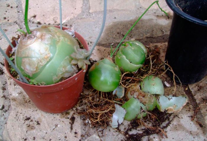 Для того щоб розмножити бовиэю, потрібно молоду цибулину акуратно відокремити від материнської рослини. Її відразу ж слід посадити в окрему, постійну ємність і забезпечити такий же догляд, як і за дорослим квіткою.