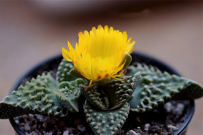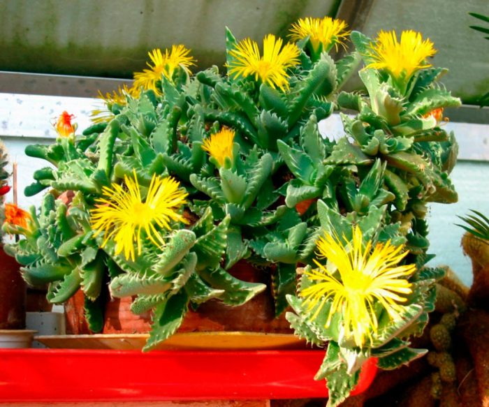 Така рослина є многолетником. У нього є коротеньке м'ясисте кореневище і укорочене стебло. Як правило, з часом воно сильно розростається і може утворити цілі куртини, до складу яких входить безліч стебел. Кожна листова розетка включає в себе від 3 до 6 пар соковитих і досить товстих листочків, які розташовуються хрестоподібно. Вони можуть бути пофарбовані в різні кольори як темно-, так і блідо-зелені, з білуватим крапом або штрихами. На кромках листя розташовуються остисті вирости або волосоподібні зубці. Поодинокі квіточки володіють досить великим розміром, так, їх діаметр може досягати 6-7 сантиметрів. Вони мають велику кількість пелюсток, які пофарбовані в різні відтінки жовтого кольору. Розпускання квіточок відбувається в денний час, при цьому в нічний час вони закриваються. Кожна квітка тримається близько 6-8 діб.