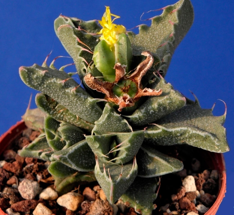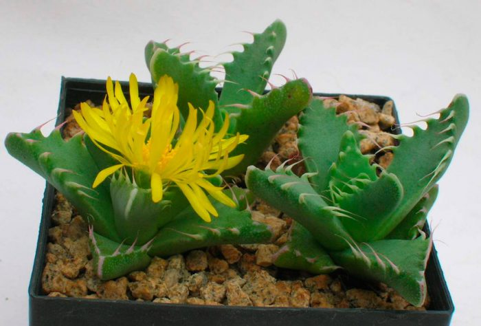 Цей сукулент у висоту досягає всього 5 сантиметрів. Ромбічної форми зеленувато-сірі листочки мають на кінчиках загострення. На їх поверхні розташовується безліч білуватих крапок, які розміщуються смужками, при цьому по краях знаходиться 9 або 10 пар загнутих назад міцних зубчиків, які мають волосовидні закінчення. Золотисто-жовті квітки в діаметрі досягають 5 сантиметрів.