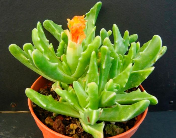 У даного сукулент є м'ясисті листочки, в довжину досягають 3 сантиметрів. По краю розташовано 5 або 6 зубців досить великого розміру, які переходять у щетинку. Квітки досить великі, так, їх діаметр дорівнює 8 сантиметрам. Вони пофарбовані в золотисто-жовтий колір, при цьому кінці пелюсток мають пурпурним відтінком.
