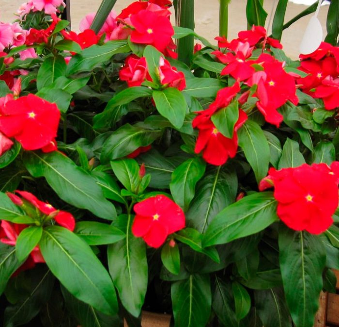 - Катарантус ампельний Титан ― довжина звисають вниз батогів близько 0,75 м, на тлі темно-зеленою блискучою листя яскраво виділяються насичено-червоні квітки, найчастіше сорт культивують в кашпо;