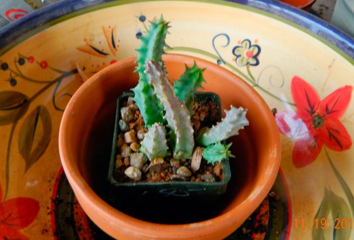 Так само вельми цікавий вид. Завдяки стеблах даний сукулент схожий з кактусом, пофарбовані в яскраво-зелений колір та має м'які товсті голки, які від сонячного світла стають червоними. Діаметр пагонів дорівнює 1,2–2 сантиметрів, а їх довжина ― 20 сантиметрів. На стеблах, як правило, є від 9 до 16 ребер (буває і більше), із-за чого зубчики розташовані дуже щільно (майже впритул притискаючись один до одного). Зубці у підстави конусоподібні при цьому вони сильно звужуються практично біля самої поверхні і залишають тоненькі підлозі сантиметрові хвостики, завдяки чому кущик виглядає пухнастим.
