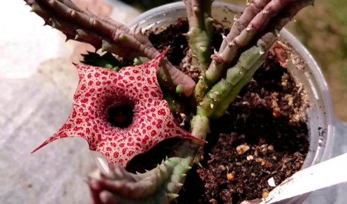 Це ампельний вид. Його пониклі стебла досягають у довжину 150 сантиметрів. Циліндричної форми пагони мають діаметр 9 сантиметрів. Ребра на них майже не помітні, при цьому зубці виглядають, як не дуже великі горбки. Квіточки порівняно невеликі, всього 2 сантиметри в діаметрі. Вони входять до складу малоквіткових суцвіть (від 2 до 5 штук). Червонувато-бордовий відгин схожий за формою з широколучевой зіркою (практично п'ятикутник), при цьому промені у неї трохи відігнуті назад. Зів трубки має більш темний відтінок, практично чорно-бордовий.