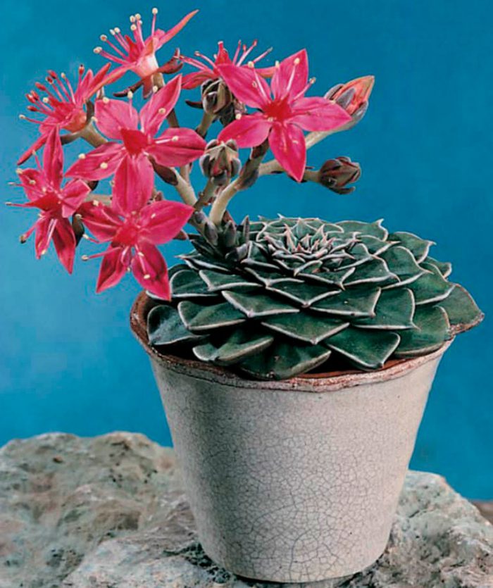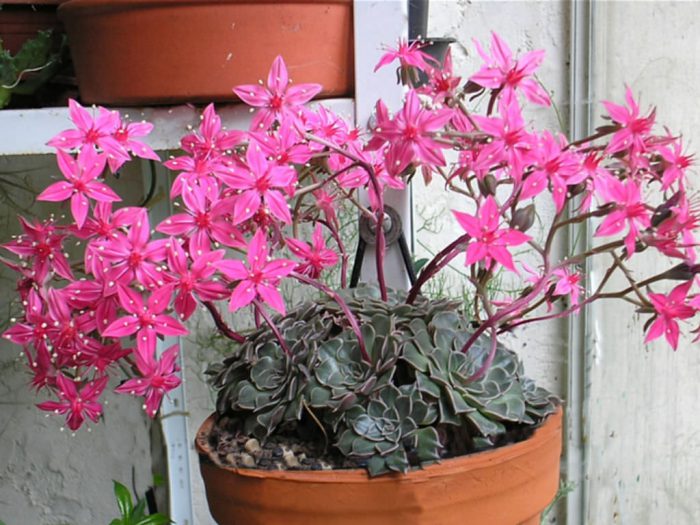Із-за того що листові розетки досить об'ємні, досить довгі квітконоси лише трохи підносяться над кущиком. Маленькі п'ятипелюсткові квіточки не представляють декоративної цінності. На поверхні білих пелюсток знаходиться кілька червонуватих точок.
