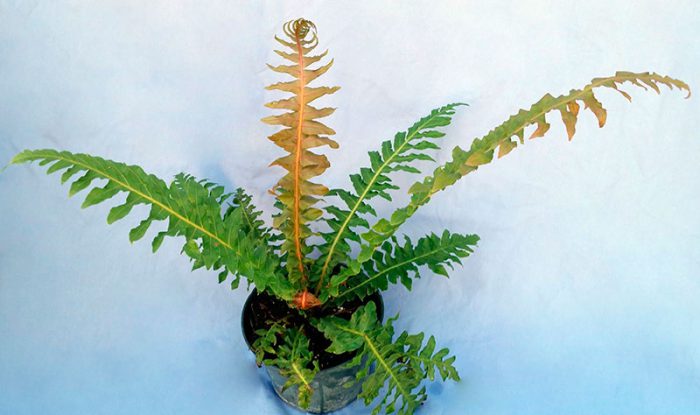 Так, папороть негативно реагує на низьку вологість повітря, важкий або невідповідний субстрат, полив невідповідною і холодною водою, інтенсивне освітлення, на порушення температурного режиму і так далі. У всіх цих випадках реакція блехнума буває практично однаковою. Вайі міняють свій колір на жовтий, на їх поверхні утворюються плями, а листові частки при цьому скручуються.