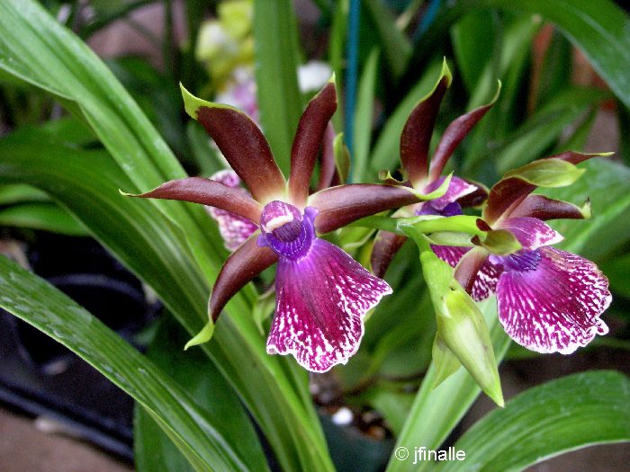 Квітконіс в довжину може досягати 25 сантиметрів, при цьому квіточки мають діаметр від 5 до 6 сантиметрів. Вузенькі, майже ременеподібні пелюстки і чашолистки мають рівномірним коричнево-бордовим забарвленням. При цьому в їх основі знаходяться цятки зеленого кольору. На білосніжному пелюстці є смужки-прожилки розмитого фіолетового забарвлення.