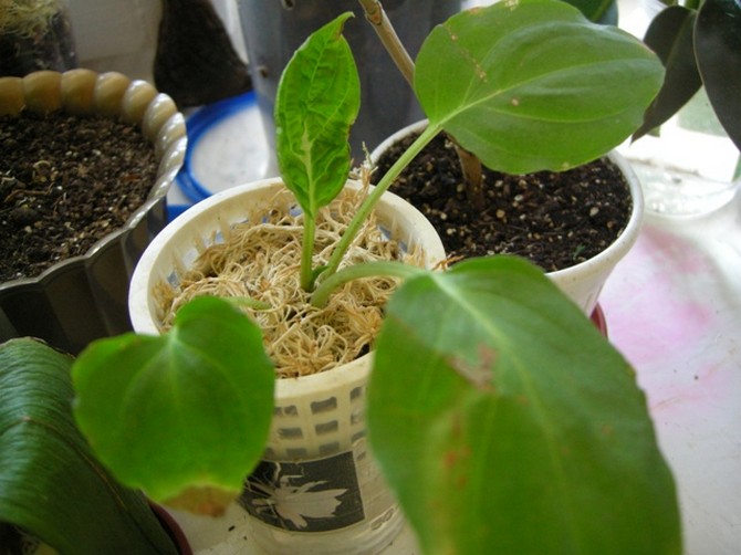 Перед тим як переступити до поділу кореневища, необхідно акуратно обрізати частину рослини, що підноситься над поверхнею грунту. Потім необхідно поділити кореневище на кілька частин, скориставшись для цього дуже гострим ножем. Місця зрізів потрібно обробити товченим деревним вугіллям, а потім залишити деленко на 24 на відкритому повітрі для просушування. Горщики для посадки треба вибирати такі, які будуть відповідати величині деленок, і їх потрібно заповнити легкої грунтом.